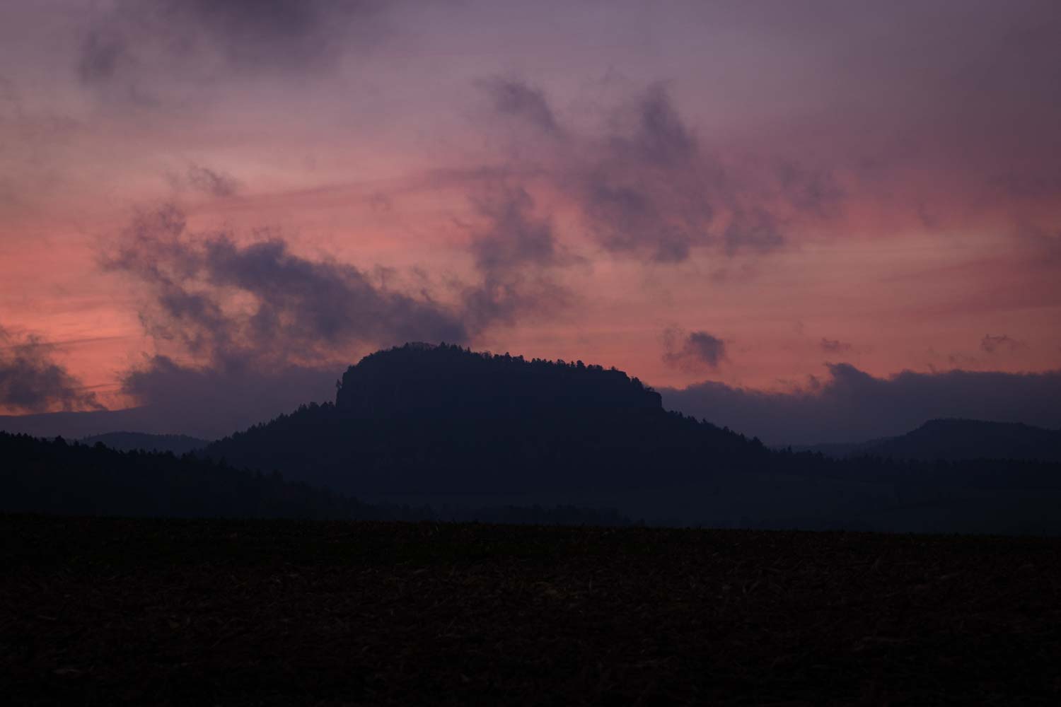 Donnerstag, der 13. November: Gestern Abend hatten wir mit einer kleinen Gruppe Fotografen beschlossen, morgens den Sonnenaufgang am Lilienstein zu fotografieren. So hieß es, kurz vor halb 6 aufstehen und im Dunklen los. Wir packten Mandy und Martin ein, mussten wegen einem am Vortag eingestürzten Haus einen ziemlichen Umweg fahren, kamen aber noch rechtzeitig vor Sonnenaufgang an.