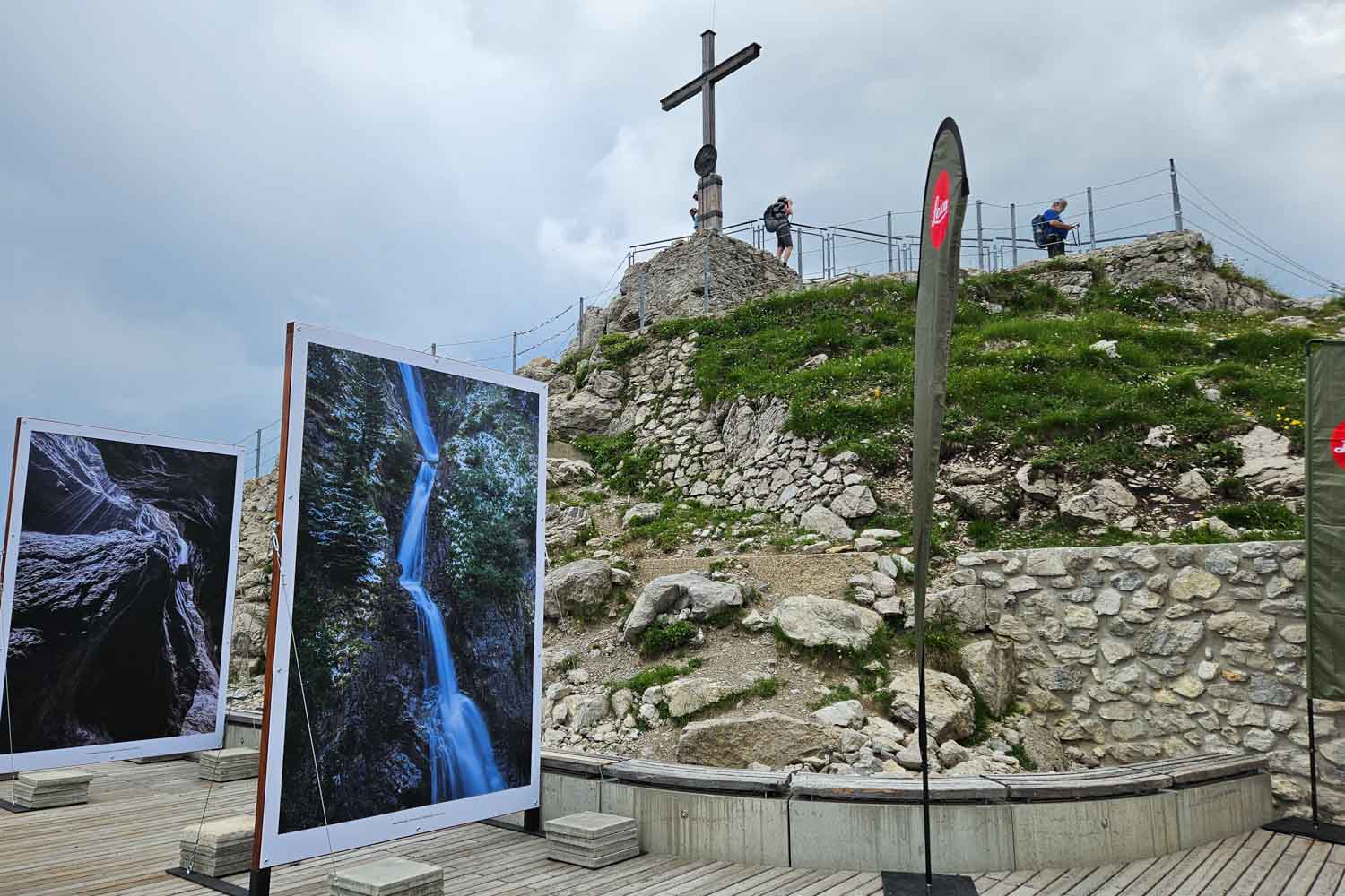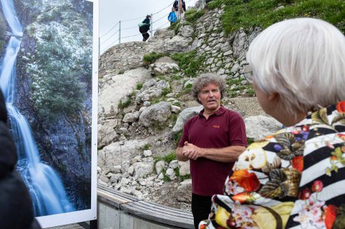 Auf dem Gipfel vom Nebelhorn bewunderten wir die beeindruckenden Bilder von Bernd Ritschel, der dieses Jahr gemeinsam mit Christian Neureuther fotografischer Schirmherr war. Wieder im Tal angekommen, konnte ich noch schnell einige Hauptakteure des Fotogipfels vor der Ausstellung von Stephan Fürnrohr (GDT) fotografieren – gerade rechtzeitig, bevor der Regen einsetzte. Nach einem kurzen Abstecher ins Gästehaus und einem Kameracheck machte ich mich wieder auf zum Oberstdorf-Haus.