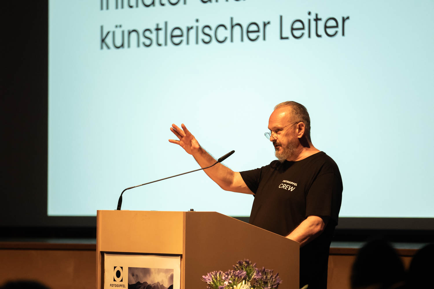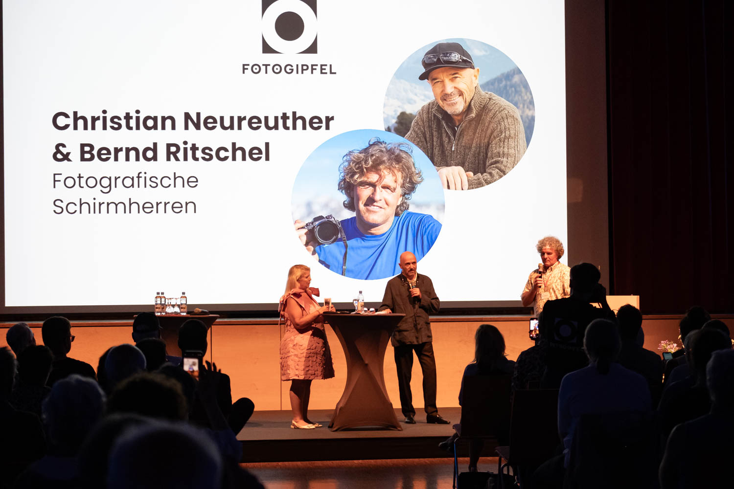 Der Eröffnungsabend war stimmungsvoll: Schon kurz nach 18 Uhr versammelten sich viele Gäste im großen Saal zum offiziellen „Come Together“. Ich sicherte mir ein Getränk und einen Platz bei meinen Fotofreund:innen in den vorderen Reihen – war aber wie immer mit meinen Kameras unterwegs, um die Schirmherren und -damen im Bild festzuhalten. Eröffnet wurde der Abend wie in den Jahren zuvor von der stellvertretenden Tourismusdirektorin Petra Genster, die uns schon auf das Thema „Wasser“ und die folgenden Redner einstimmte. Bevor es losging, gab es noch den offiziellen Fotogipfel-Film zu sehen – der wirklich wunderbar ist! Anschließend gab es die Reden von Claudia Roth, Bürgermeister Klaus King und Christian Popkes, die sehr gut ankamen und auch zum Nachdenken anregten. Danach standen die fotografischen Schirmherren von diesem Jahr, Christian Neureuther und Bernd Ritschel, auf der Bühne.
