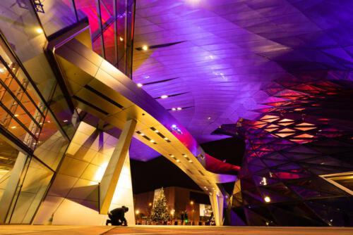 Bei Einbruch der Dunkelheit machte ich mich mit einem kleinen Teil unserer Gruppe nochmal auf den Weg zur BMW-Welt, die beleuchteten Gebäude waren einfach toll als Fotomotive. Dann wurde es aber doch ungemütlich, Schneefall setzte ein und so war der tolle Fototag dann auch für mich gegen 18 Uhr vorbei.