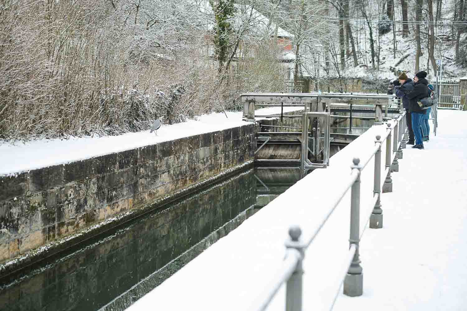 Über Nacht hatte es tatsächlich geschneit – ein kleines Wintergeschenk zum Dreikönigstag. Wir trafen uns gemütlich kurz vor 9 Uhr zum Frühstück. Leider mussten wir uns von den ersten Beiden aus der Gruppe schon in der Früh verabschieden. Der Rest unserer Gruppe machte sich nach dem Check-Out auf die Suche nach winterlichen Fotospots. Es ging zu einer Schleuse, später durch ein paar Gassen, die wir noch nicht fotografiert hatten.