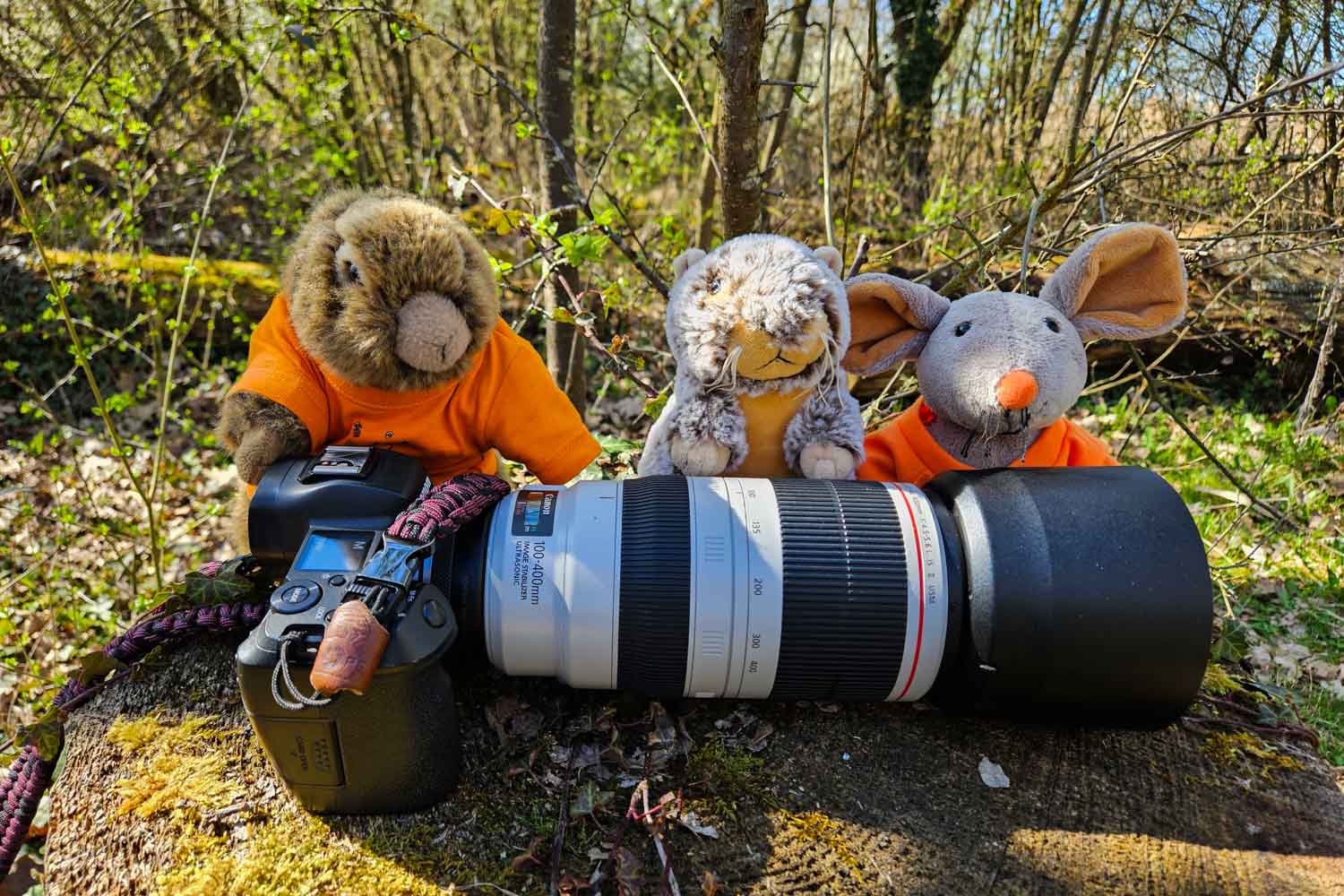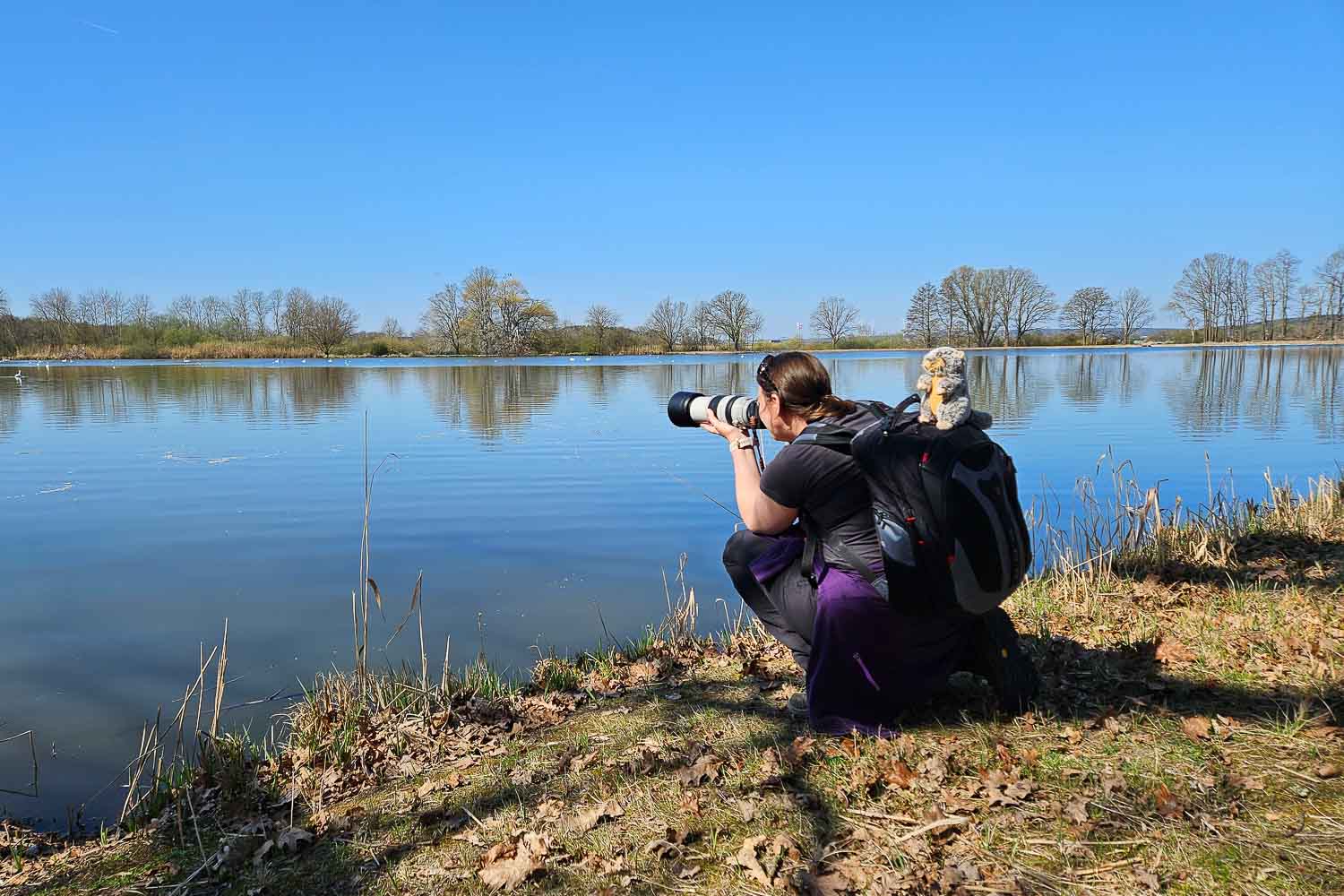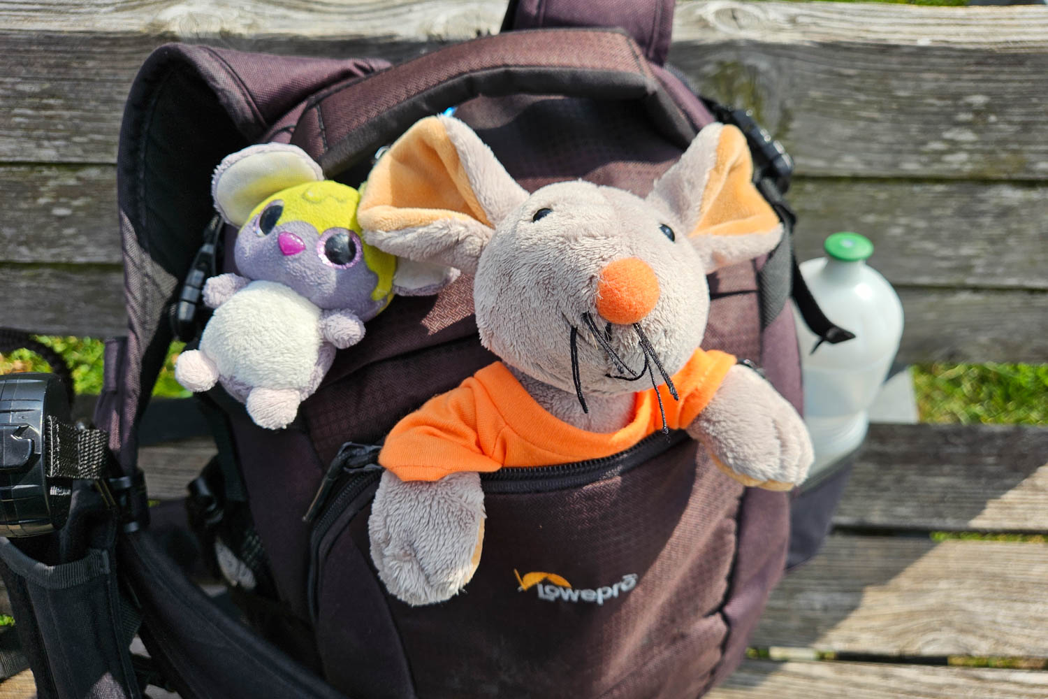 Leider gab es an den Weihern keinerlei spannende Motive. So ging es weiter bis zu einem großen Spielplatz, wo ich einige Fotos von Chrissy’s Söhnen beim Spielen machte – und wir kamen auf die lustige Idee, die ersten Bilder mit den „Plüschis“ zu machen. Die ersten Videos wurden gedreht – aber Fotos von Tieren oder der Landschaft sind ansonsten kaum entstanden, da war zu wenig los.