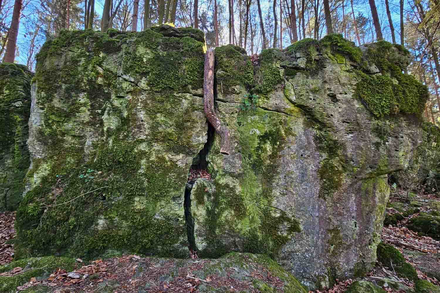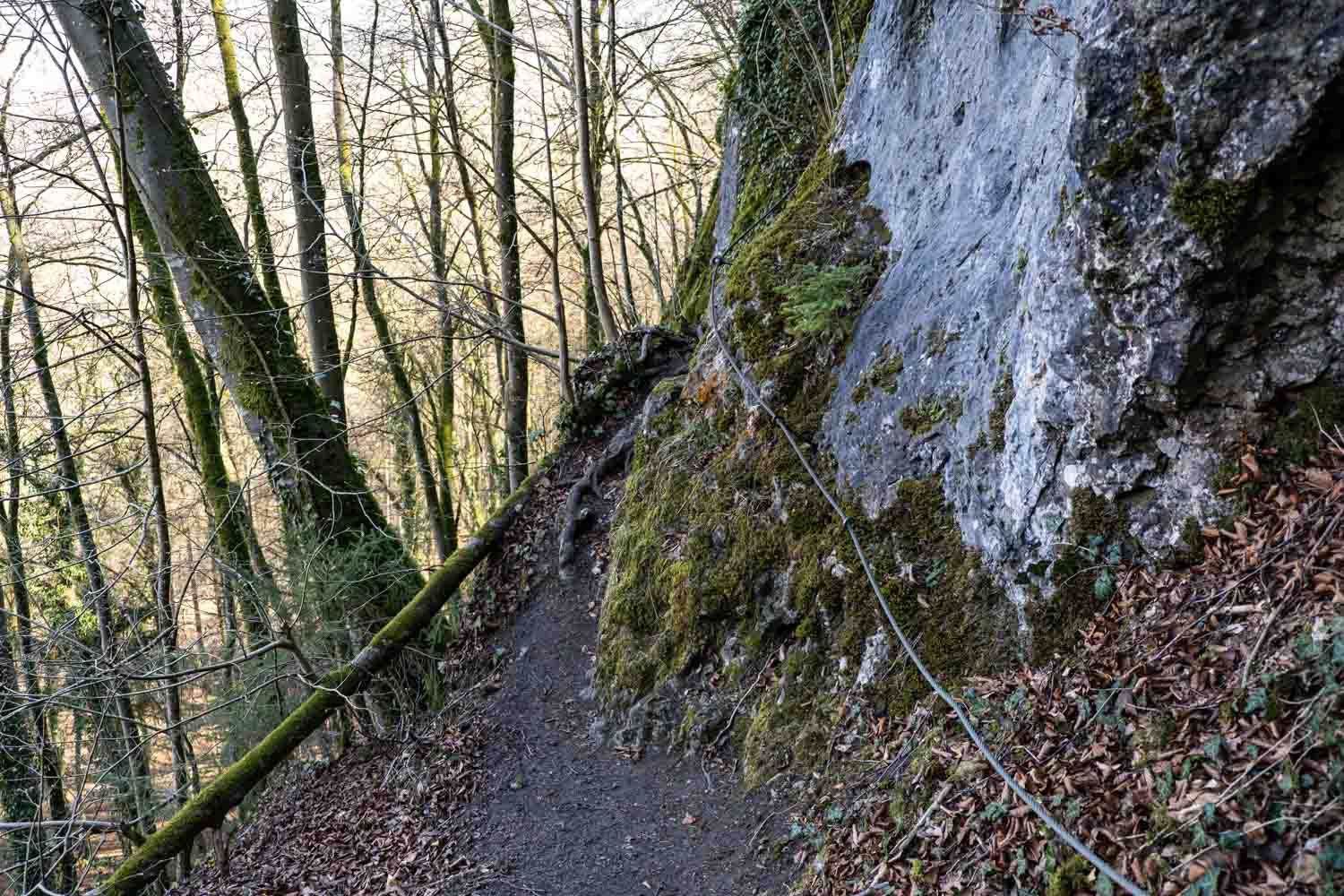 Es ging relativ steil nach oben durch einen schönen Wald. Wir drehten wieder ein paar Videos, ein bisschen „Storytelling“ will einbehalten werden. Die Burgruine kannte Chrissy natürlich schon, ich war ziemlich begeistert von dem Bauwerk – und der Ausblick vom Burgturm war wirklich toll! Nach einer kleinen Snackpause ging es Richtung der Grotten. Im Winter darf man diese nicht besuchen, da hier Fledermäuse überwintern. Jetzt war aber nichts los, keine Wanderer und so konnten wir die Ruhe genießen. Der Blick zur Ruine Neideck ist auch schön – und ich überwand meine Höhenangst und ging den sehr schmalen „Weg“ am Stahlseil hoch zur letzten Grotte. Da pochte mein Herz schon ziemlich, ich war froh, wieder zurück bei Chrissy zu sein.