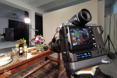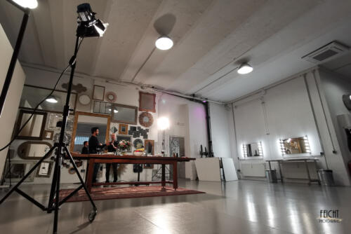Zu Beginn verschaffte ich mir einen kurzen Überblick. Ein übersichtliches, helles Studio mit toller Deckenhöhe. Ein Bereich zum gemütlichen Zusammensitzen, ein Küchenbereich, von dem aus für leckere Snacks und Getränke gesorgt wurde. Daneben eine kleine Theke mit den „Hauptdarstellern“ des Tages, den GFX-Kameras. in einem Bereich des Studios war alles zum Thema „Peoplefotografie“ aufgebaut, an einer anderen Stelle stand ein großer Holztisch mit vielen schönen Dingen, die zum Testen der Kameras im Bereich der Stilllife-Fotografie aufgebaut waren.