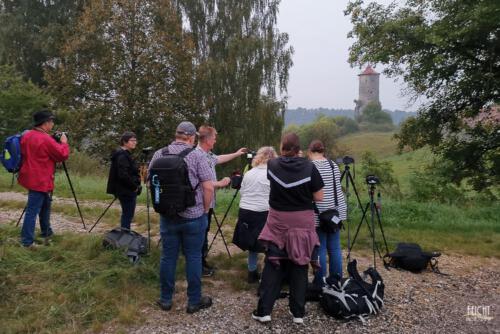 Zwischendrin gab es schon mal das erste Gruppenbild auf der Wiese, wir hatten aber noch ein gutes Stück vor uns. Es ging vorbei an einer wunderbaren Blütenwiese, zu der uns Yanik als Hobbyimker einige spannende Infos geben konnte. Irgendwann war es aber geschafft, wir kamen alle an der Burg an. Josef wartete schon auf uns, um noch ein „Burg-Gruppenbild“ von uns zu machen. Ein paar Leute aßen eine Kleinigkeit. Die Burg schaute ich mir mit ein paar anderen nur von außen an, es gab einen tollen Weg durch den Wald, der uns mehr reizte. Und dann schloss ich mich der kleinen Gruppe an, die sich die Raubvogel-Schau ansahen. Das war wirklich schön und nachher hatten wir die Möglichkeit, ein paar der wunderbaren Tiere aus der Nähe zu fotografieren. Teilnehmerin Silke stellte sich sogar als Model zur Verfügung – sie wollte unbedingt den Adler auf dem Arm halten, was ich sehr gut nachvollziehen konnte!
